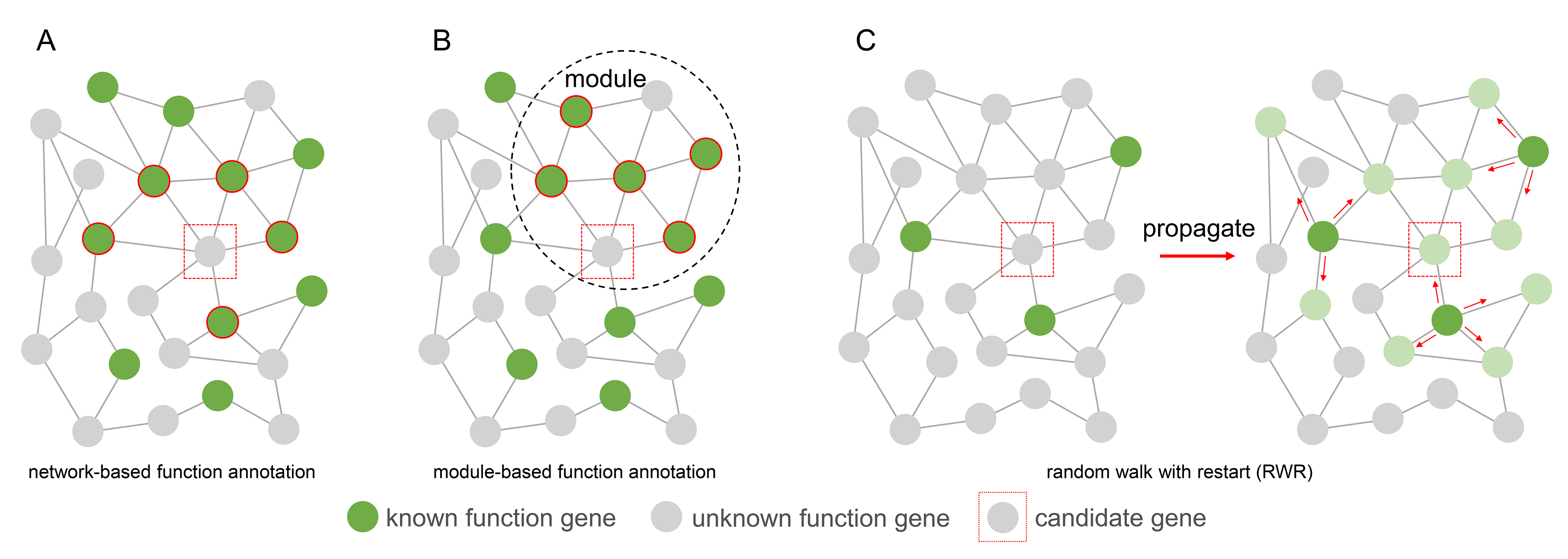 After gene co-expression network construction and module identification, we use gene function enrichment to predict novel lncRNAs or coding gene function. According to the Guilt-By-Association (GBA) principle, the function of an unknown gene was determined by the voting of its neighbor genes with known functions. These neighbor genes can be directly interacted genes in the network (Figure 2A), or they can be genes in the same module (Figure 2B). Another gene function analysis algorithm we implemented is the random walk with restart (RWR) (Figure 2C), which measures each node’s relevance with respect to given seed nodes (here are genes with known function annotations) based on network propagation. The information (known gene function) is propagated through the edges from seed nodes to nearby nodes until convergence. To the end, prior information associating genes with a function of interest is super imposed on the nodes of the network.