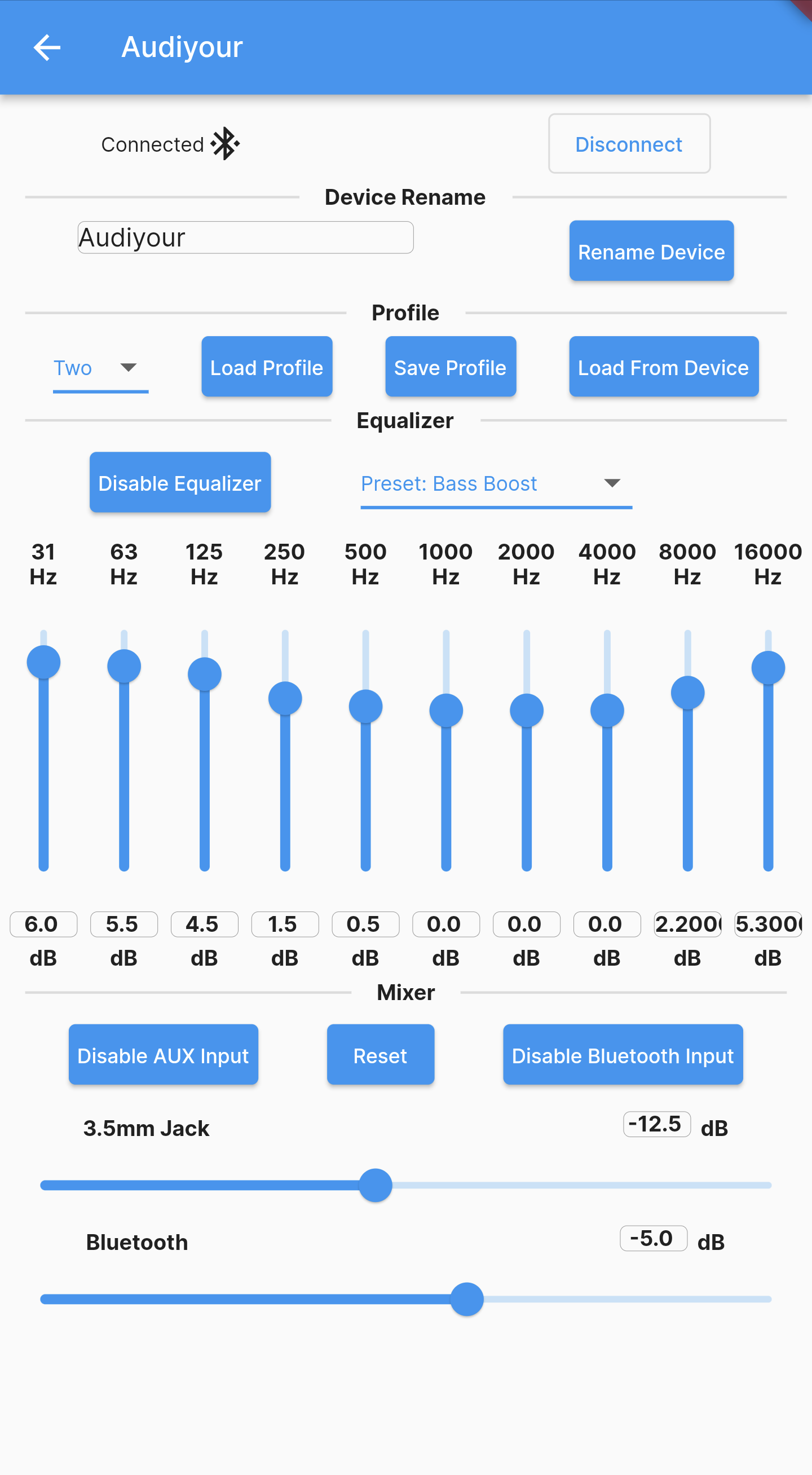 The Audiyour Control app for desktop is built on the Qt5 toolkit and is written in Python. This cross-platform app allows the user to set the equalizer and mixer gains, or disable them entirely. The Qt Python GUI source code is in the gui_qt folder.