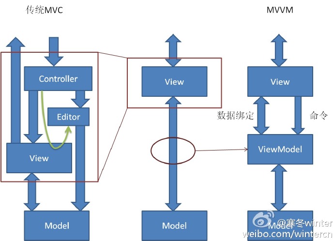 所以时至今日,MVC,尤其是其中controller的功能已经意义不大,若是在控件系统中,再令所有用户输入流经一个controller则可谓不伦不类、本末倒置。MVVM的提出者,微软架构师John Gossman曾言:“我倾向于认为它(指controller)只是隐藏到后台了,它仍然存在,但是我们不需要像是1979年那样考虑那么多事情了”