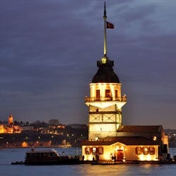 "text": "a large ship in a body of water with Maiden's Tower in the background",