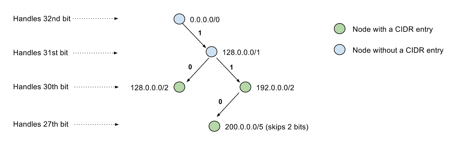 Visualization of trie storing same CIDR blocks with path compression, improving both lookup speed and memory footprint.