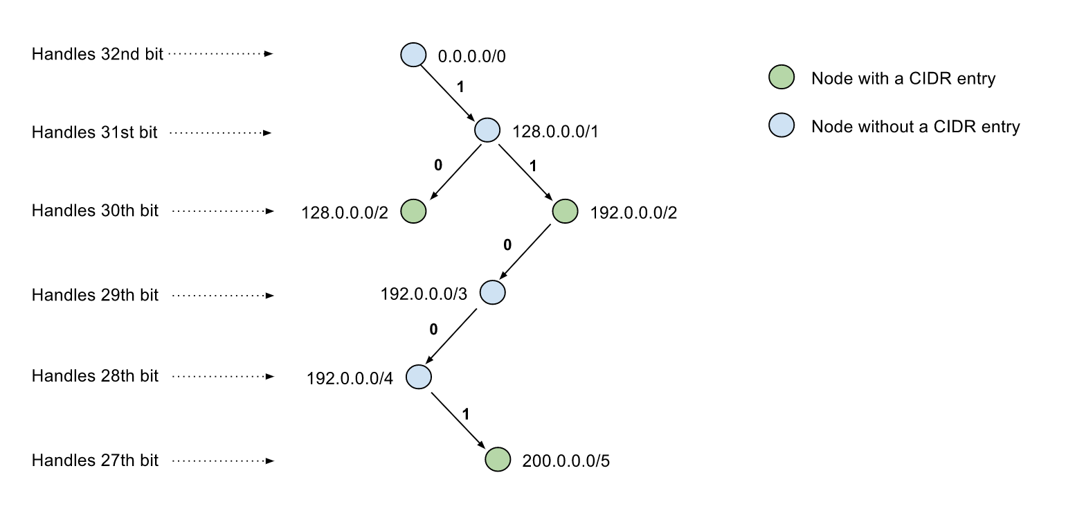This is visualization of a trie storing CIDR blocks 128.0.0.0/2 192.0.0.0/2 200.0.0.0/5 without path compression, the 0/1 number on the path indicates the bit value of the IP address at specified bit position, hence the path from root node to a child node represents a CIDR block that contains all IP ranges of its children, and children's children.