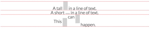 之所以要把 top 和 bottom 单独拎出来讲,是因为它俩的对齐方式与其他值不一样,它俩是使元素相对于线框(line box)对齐,至于线框,可以理解为内联级元素在一行中一个挨一个地排列,一旦当前行放不下了,就在它下方创建一个新行,所有这些行就是所谓的线框(line box),用来包住这一行的所有内容。不同大小的内容意味着不等高的线框,下图红色的线就是线框边界,可以看出它的高度取决于最顶部内容和最底部内容的差。