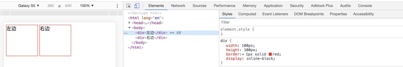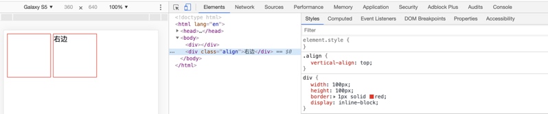 可以看到左边的 div 的中点与父元素基线加上父元素 x-height 的一半对齐了,然后再对右边的 div 同样添加 vertical-align:middle,这样右边的 div 的中点也同父元素基线加上父元素 x-height 的一半对齐,所以最终两个 div 对齐。
