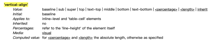 从文档上可以看到,value 值有 baseline、sub、super、...,初始值为 baseline,仅作用于 inline-level 和 table-cell 的元素,也就是说对于 block 元素是不起作用的,无继承,如果后面跟的是百分比值,那么取决于元素本身的 line-height 值。