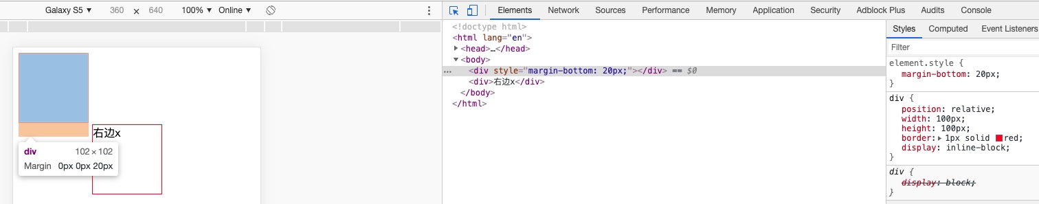 第一个 div 没有内容,所以基线是下边距边界,第二个 div 包含了内容文本,所以它的基线是最后一行的 line box 基线,两个 div 都是以默认 baseline 对齐方式,所以呈现第一个 div 的下边距边界与第二个 div 的内容基线对齐。同样为了验证上面的解释,我们在第二个 div 内写入两行文本,可以看到左边的 div 与第二个文本底部对齐了;或者是对左边的 div 添加一个下边距,可以看到下边距与右边的文本底部对齐了,所以两个 case 都再次证明上面的解释是正确的。